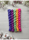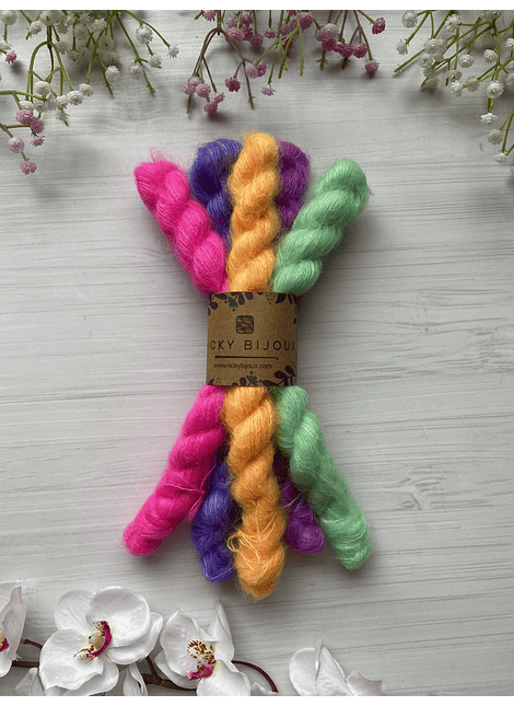 Es importante destacar que estos hilados son tratamientos 1 a 1 y que las mini madejas son hechas de manera artesanal. Cada ramillete contiene: